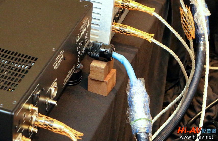 一般參觀民眾是不會走到喇叭及器材後方觀察的,但「鈦孚音響」可不是只做表面功夫的代理商,任何會影響整體音樂重播表現的地方都仍不放鬆,像是Siltech電源線重量過人,倘若僅是插在器材後方電源插孔上,線材的重量會將電源線插頭往下拉,其實會造成接觸不夠緊密、接觸面積減小而產生負面影響的狀況,這張照片可以清楚看到鈦孚使用木塊支撐Siltech電源線插頭,如此就可避免上述狀況發生。