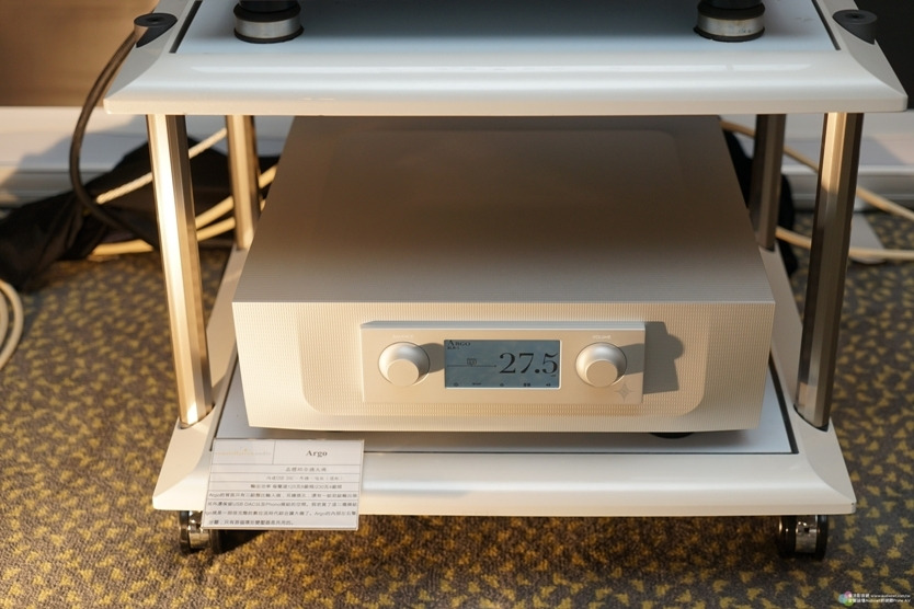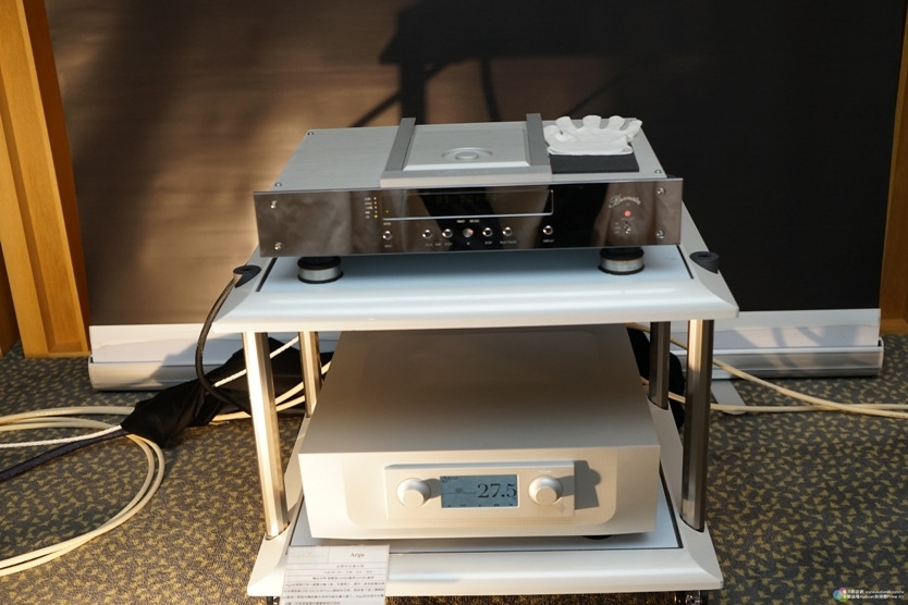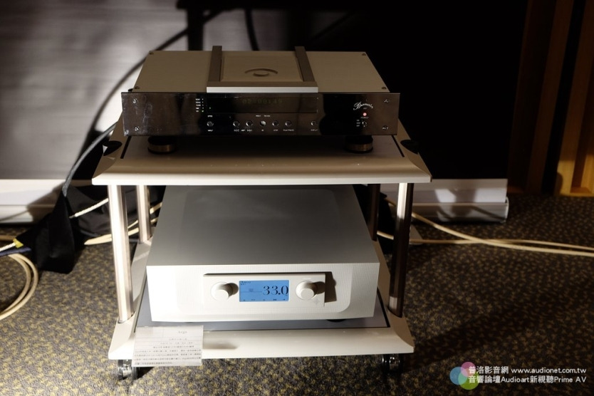 音響架上層是Burmester 061 CD唱盤,下層為Constellation Audio Argo綜合擴大機。Argo採用與旗艦前級Altair II相同的Line Stage Gain Module全平衡放大電路,以人工配對的FET場效電晶體和精確伺服電路,將音訊信號的正半波與負半波平衡放大;其在放大模組部分也延用旗艦單聲道後級 Hercules II的平衡橋接作法,以單端驅動高音質電路提供每聲道125瓦的推力。當然,Argo也有原廠堅持的懸浮避震線路板設計,並以極精準的光敏電阻作為音量控 制器,可說是該廠集技術大成的「璀璨星辰」。
