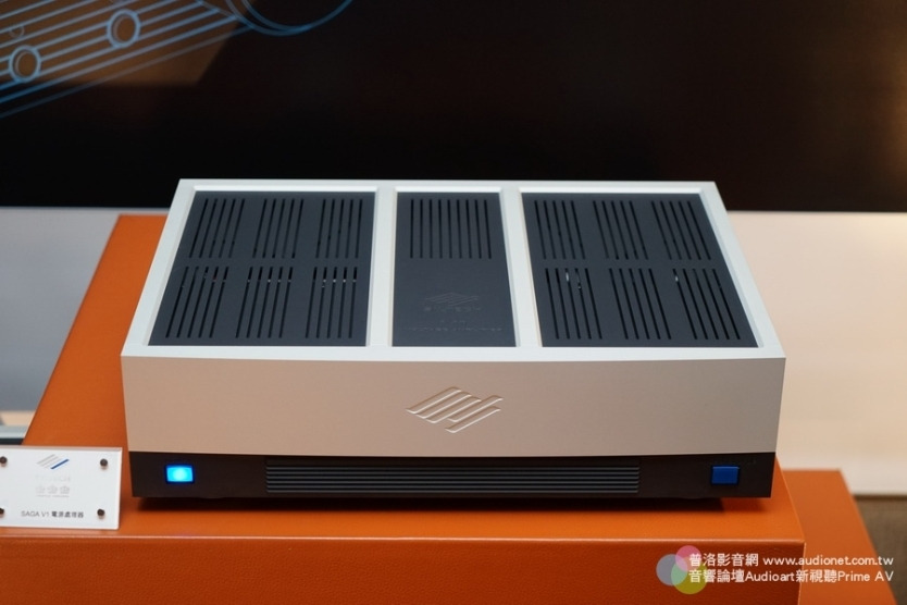 照片中央下層音響櫃內的是Siltech的電源排插,上方三部就是Siltech的SAGA終極擴大機系統,由左到右分別是C1前級、P1電流放大 與V1電壓放大。看到SAGA這三件式前後級擴大機系統,絕大多數人都會認為其中一件是前級的分離式電源機箱,但其實Edwin是將後級的電壓放大部分與 電流放大部分一切為二(所謂「SAGA」就是Structural Amplifier Gain Architecture「分體級進式放大增益架構」之縮寫,也有「史詩」或「傳奇」之意),除了將前級擴大機的增益由一般的20dB降低為10dB,至 於後級分為兩部是為了讓兩階段的放大確實隔離,